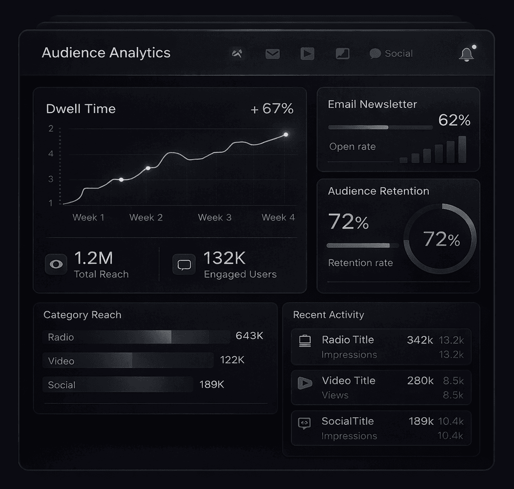 Structured visibility across radio, video, digital and community platforms within one trusted environment.
